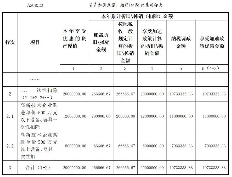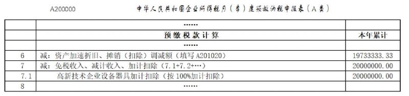 第一步:在《中華人民共和國企業(yè)所得稅月(季)度預繳納稅申報表(A類(lèi))》(A200000)和《資產(chǎn)加速折舊、攤銷(xiāo)(扣除)優(yōu)惠明細表》(A201020)相關(guān)行次填報稅前一次性扣除情況。通過(guò)手工申報的,根據設備、器具購進(jìn)情況,在《資產(chǎn)加速折舊、攤銷(xiāo)(扣除)優(yōu)惠明細表》(A201020)第2行“二、一次性扣除”下的明細行次中,分別填寫(xiě)“高新技術(shù)企業(yè)購進(jìn)單價(jià)500萬(wàn)元以下設備、器具一次性扣除”和“高新技術(shù)企業(yè)購進(jìn)單價(jià)500萬(wàn)元以上設備、器具一次性扣除”事項及其具體信息。填報完成后,將“納稅調減金額”列次的合計值(第3行第5列)同步填寫(xiě)在《中華人民共和國企業(yè)所得稅月(季)度預繳納稅申報表(A類(lèi))》(A200000)第6行“資產(chǎn)加速折舊、攤銷(xiāo)(扣除)調減額(填寫(xiě)A201020)”中。通過(guò)電子稅務(wù)局申報的,可在《資產(chǎn)加速折舊、攤銷(xiāo)(扣除)優(yōu)惠明細表》(A201020)的下拉菜單中選擇相應的優(yōu)惠事項,并填寫(xiě)具體信息,申報系統將同步自動(dòng)填報《中華人民共和國企業(yè)所得稅月(季)度預繳納稅申報表(A類(lèi))》(A200000)第6行“資產(chǎn)加速折舊、攤銷(xiāo)(扣除)調減額(填寫(xiě)A201020)”。第二步:在《中華人民共和國企業(yè)所得稅月(季)度預繳納稅申報表(A類(lèi))》(A200000)第7行“減:免稅收入、減計收入、加計扣除”下的明細行次填報加計扣除情況。手工申報的,在明細行次填寫(xiě)“高新技術(shù)企業(yè)設備、器具加計扣除(按100%加計扣除)”事項及加計扣除金額。通過(guò)電子稅務(wù)局申報的,申報系統自動(dòng)填報相關(guān)事項及加計扣除金額。