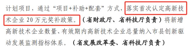 獎勵政策:對首次認定高新技術(shù)企業(yè)獎勵20萬(wàn)元。