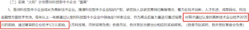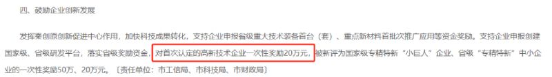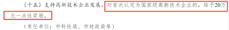 獎勵政策:對首次認定的高新技術(shù)企業(yè)一次性獎勵20萬(wàn)元。