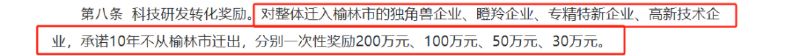 獎勵政策:對整體遷入榆林市的獨角獸企業(yè)、瞪羚企業(yè)、專(zhuān)精特新企業(yè)、高新技術(shù)企業(yè),承諾10年不從榆林市遷出,分別一次性獎勵200萬(wàn)元、100萬(wàn)元、50萬(wàn)元、30萬(wàn)元。