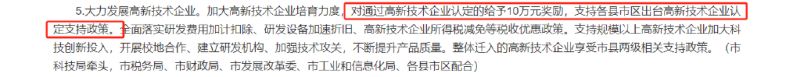 獎勵政策:對通過(guò)高新技術(shù)企業(yè)認定的給予10萬(wàn)元獎勵,支持各縣市區出臺高新技術(shù)企業(yè)認定支持政策。