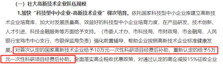 獎勵政策:對首次認定的國家高新技術(shù)企業(yè)給予10萬(wàn)元一次性科研項目經(jīng)費后補助,重新認定的給予5萬(wàn)元一次性科研項目經(jīng)費后補助。