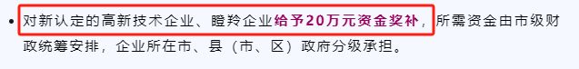 獎勵政策:對新認定的高新技術(shù)企業(yè)、瞪羚企業(yè)給予20萬(wàn)元資金獎補。